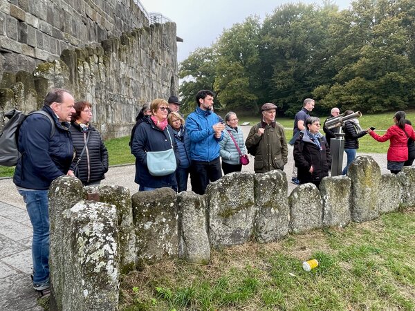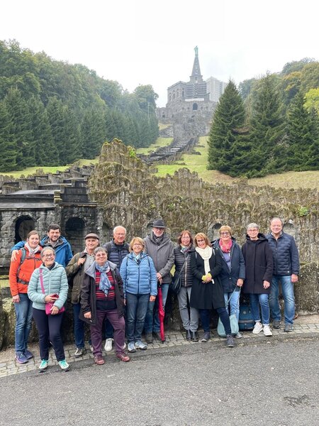 Auch im Regionalmuseum kamen Unterhaltung und Neugier nicht zu kurz: Die Gäste erkundeten das nachgestellte Bergwerk im Keller und nahmen im historischen Klassenzimmer Platz – mit einem Augenzwinkern stellten sie die „neuzeitliche Unterrichtssituation“ mit gezückten Handys nach. Auch das große Playmobil-Diorama „Kaufungen zu Kunigundes Zeiten“ stieß auf große Begeisterung. Nach einer kleinen Stärkung mit „Ahler Wurscht“, Käse und Bauernbrot stand ein Ausflug zum Herkules nach Kassel auf dem Programm. Trotz diesigen Wetters bot der Abstieg entlang der Kaskaden, der Besuch der Löwenburg und des Schlosses Wilhelmshöhe eindrucksvolle Erlebnisse. Beim abendlichen Buffet im Bürgerhaus wurde der Tag in geselliger Runde beendet – mit vielen Gesprächen, Lachen und einem spontanen deutsch-französischen „Chorauftritt“, der für heitere Stimmung sorgte.