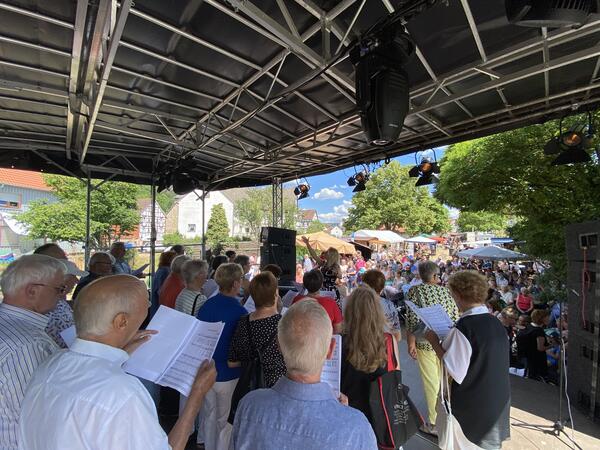 Zu einem gelungenen Volksfest gehört natürlich immer die Musik und so präsentierte sich der Chor „Haste Töne“ in der vollbesetzten Kirche Niederkaufungen. Rhythmisch ging es auch auf der Bühne zu, als die Nachwuchstänzer*innen von „Anja`s Tanzschule“ in verschiedenfarbigen T-Shirts mit ihren Choreografien begeisterten. Das Publikum war beeindruckt von der Eleganz und Freude, die Klein und Groß ausstrahlten - alle Beteiligten auf und vor der Bühne waren offensichtlich mit viel Spaß dabei.
