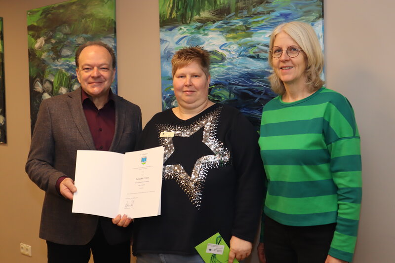 Für 25 Jahre wertvolle Arbeit bedankte sich Bürgermeister Arnim Roß und überreichte Natascha Erfurt feierlich eine Jubiläumsurkunde und ein Geschenk der Kunigundengemeinde Kaufungen. Herzlichen Glückwunsch!