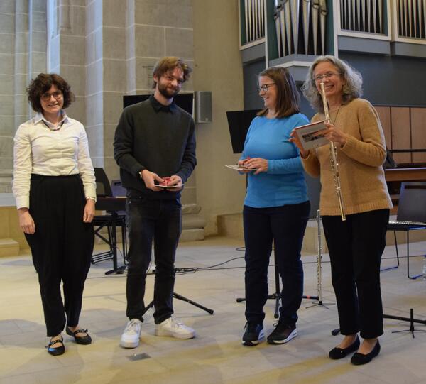 Die musikalischen Zwischenspiele aus Kombinationen von Querflöten, Klavier und Cembalobegleitung übernahm das Flötentrio bestehend aus Aiga Kronberg, Jaron Völkel und Karin Völker (für ein Quartett fiel Eva Standbein krankheitsbedingt aus) mit Werken von Mozart, Mancini, Bach und anderen Komponisten. Die musikalischen Darbietungen ließen die Zuhörenden gedanklich Teil der vergangenen Burgen- und Schlösserära werden.