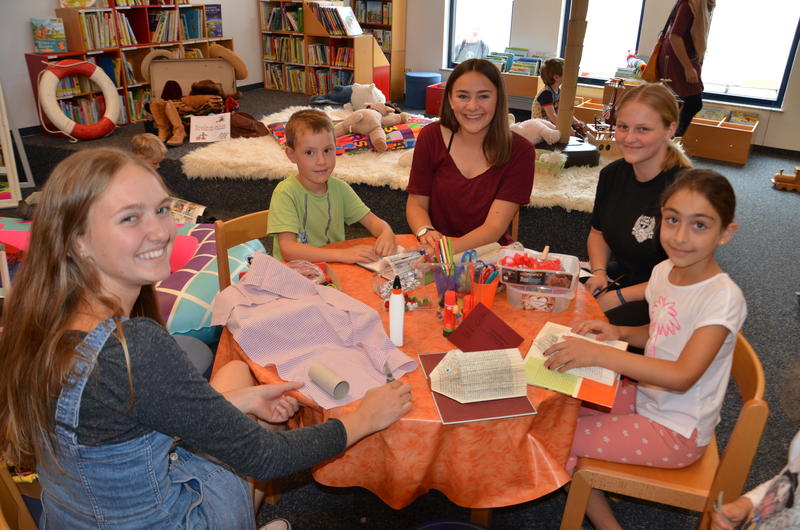 Neben der Büchereileiterin betreuen unter anderem Pia (17), Carlotta (16) und Svenja (17) den Ferienspaß. Sie basteln mit den Kindern Bücher-Igel und Lesezeichen oder spielen etwas abseits, in einer ruhigen Ecke, Halli-Galli. „Die Arbeit mit den Kindern ist toll“, sagt Svenja. Neben den Bastelaktionen bringt Lars (22), interessierten Kindern und Jugendlichen das Schachspielen bei.