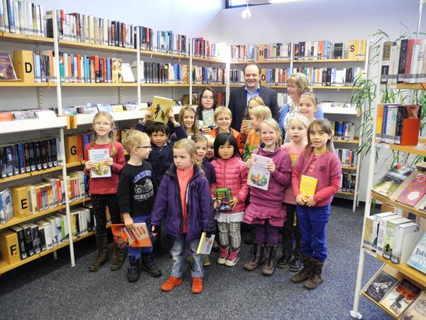 Während der Verkündung der Gewinner war die Spannung groß. Aus einem braunen Koffer durfte sich Jeder seinen Preis aussuchen. Hyori An (4 Jahre) entschied sich für ein „Halli-Galli-Spiel“, Luca Witzel (4 Jahre) interessierte sich eher für ein Feuerwehrbuch. Einen Kinderkrimi wählte die 10-jährige Marie Langefeld aus. „Es freut mich, dass alle Gewinner auch außerhalb der Ferien regelmäßig in die Bücherei kommen, um sich Bücher, CDs oder Spiele auszuleihen“, so die Büchereileiterin. Zu den ersten Gratulanten gehörte Bürgermeister Arnim Roß, der sich mit den glücklichen Gewinnern freute. „Solche Aktionen sind für die Kinder absolute Highlights, vor allem, wenn jeder Dritte die Chance auf einen Gewinn hat.“
