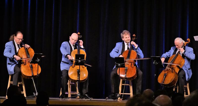 Auftritt Giora Feidman und die vier talentierten Künstler des Rastelli Cello Quartetts unter der Leitung von Kira Kraftzoff. Augenblicklich standen die Entertainer auf der Bühne im Rampenlicht und begrüßten die applaudierende Menge im Bürgersaal der Gemeinde Kaufungen.