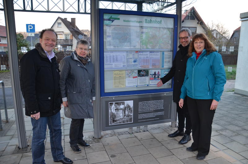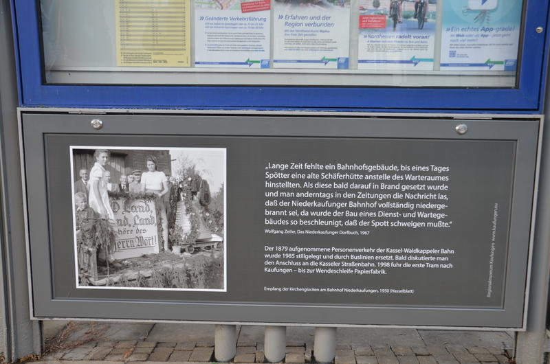 Auf jeder Folie wird eine historische Situation an diesem Ort mit Bild und Text dargestellt. An der Haltestelle „Niederkaufungen Bahnhof“ zum Beispiel ist die Anekdote über die Entstehungsgeschichte des Bahnhofsgebäudes in Niederkaufungen textlich erläutert. Dazu gibt es ein Foto von 1950 das zeigt, wie die mit einem Zug der damaligen Waldkappeler Bahn transportierte Kirchenglocke im Bahnhof Niederkaufungen feierlich empfangen wurde.