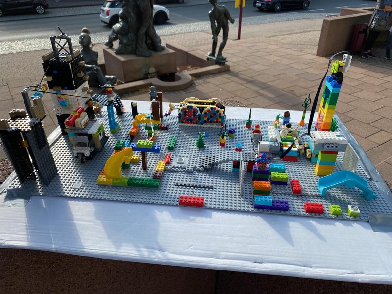 Paul zeigte die verschiedenen Stationen auf: Hangelanlage, Springgerät, Seilbahn, Hindernisparcours sowie einen Imbiss-Stand. Ein besonderes Element stellt das Herzspiel dar – eine Art Laufbandgerüst für Fahrrad- und Rollstuhlfahrer mit einem Motor, der per App steuerbar ist. Der Sinn dahinter: erst, wenn man aufgewärmt ist, darf man die anderen Spielgeräte benutzen. Alle Teile des Models wurden aus LEGO-Technik gebaut und die App von den Kindern selbst programmiert.