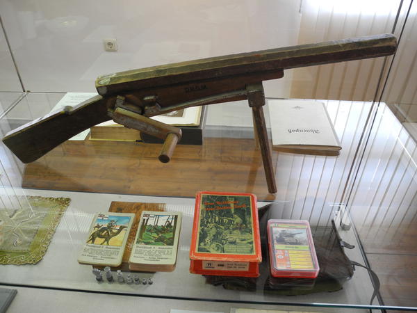 Ein hölzernes Maschinengewehr hinter Kinderstühlchen und Fußbank zieht die Blicke der Hereinkommenden an. Beim Nähertreten passiert man Kriegertafeln (1814, 1870, 1945), die ehemals in den Kaufunger Dorfkirchen hingen: Das Kriegsthema ist in der Gesellschaft immer präsent, auch in Friedenszeiten, ob in Erinnerungen der Veteranen, in öffentlicher Gedenkpolitik oder im Kinderspiel.